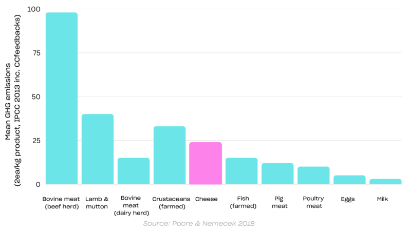 Why animal-free dairy? Dairy is the third largest source of proteins for humans, after plants and meat. According to FAO, the consumption of dairy products is projected to increase driven by higher per-capita income growth projections. From a climate perspective, dairy is not always the top worry of investors. Beef is. However, cheese GHG emissions is among the top from animal proteins, before fish and chicken, at 23 kg CO2e per kg.